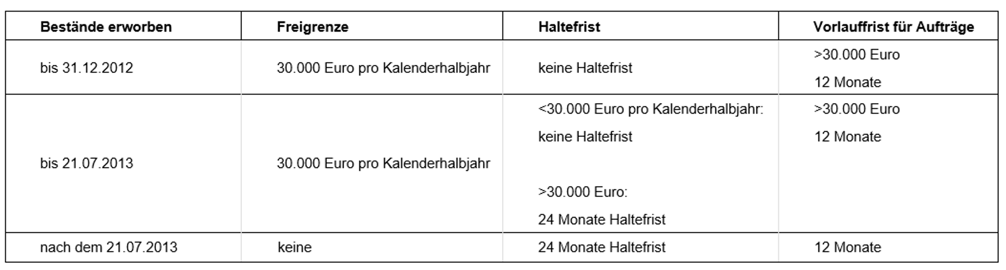 Irgendwann will man aber verkaufen. Die nachfolgende Tabelle zeigt entsprechende Freigrenzen und Haltefristen je nach Kaufdatum.